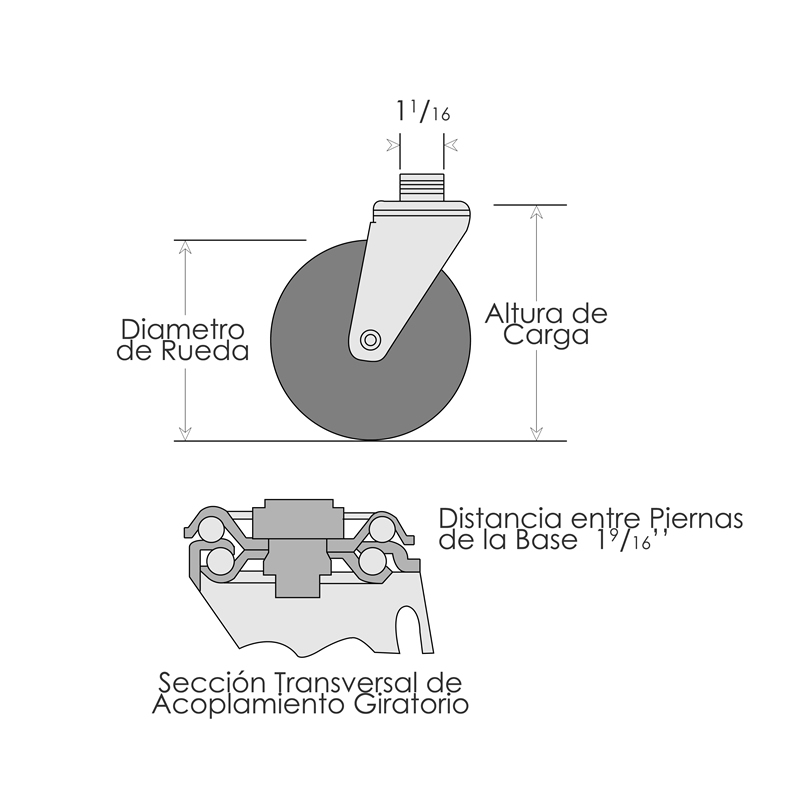 No. de Modelo | Descripcion de Rodaja | Diametro de Rueda | Ancho de Rueda | Capacidad por Rodaja | Rueda | Balero | Altura de Carga | Radio de Giro | Peso |