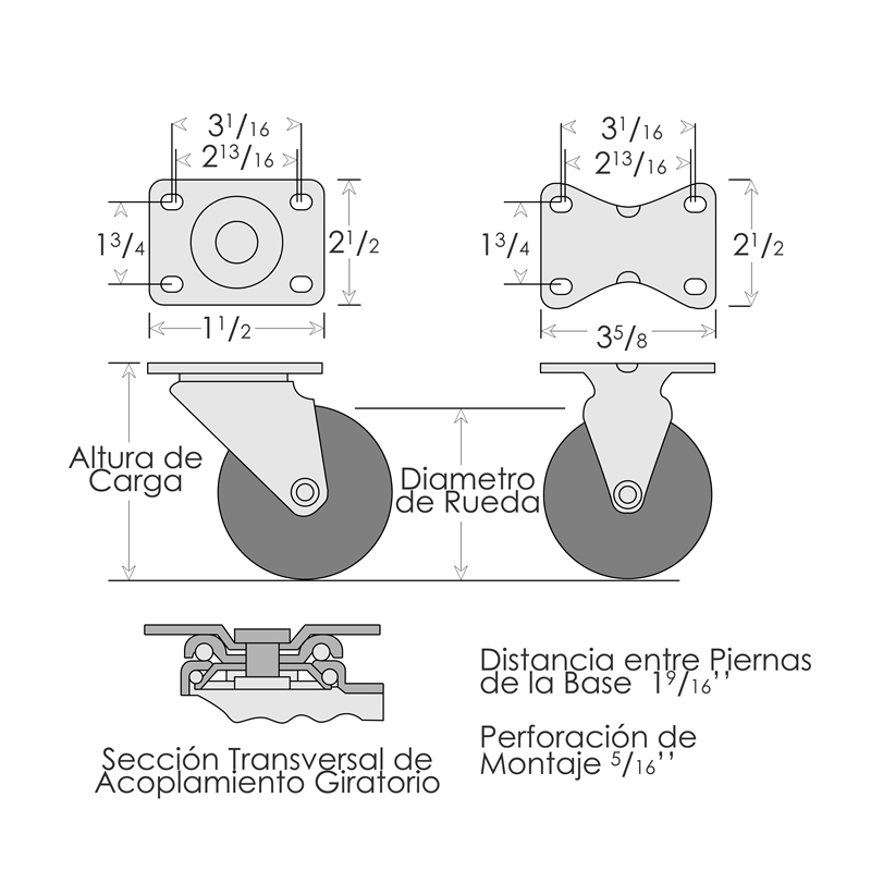 No. de Modelo | Descripcion de Rodaja | Diametro de Rueda | Ancho de Rueda | Capacidad por Rodaja | Rueda | Balero | Altura de Carga | Radio de Giro | Peso |