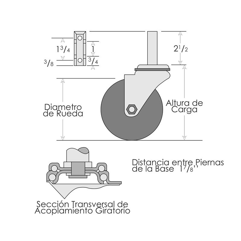- Doble hilera de baleros en giro para mejor desempeño y resistencia.Eje de rueda de 3/8".