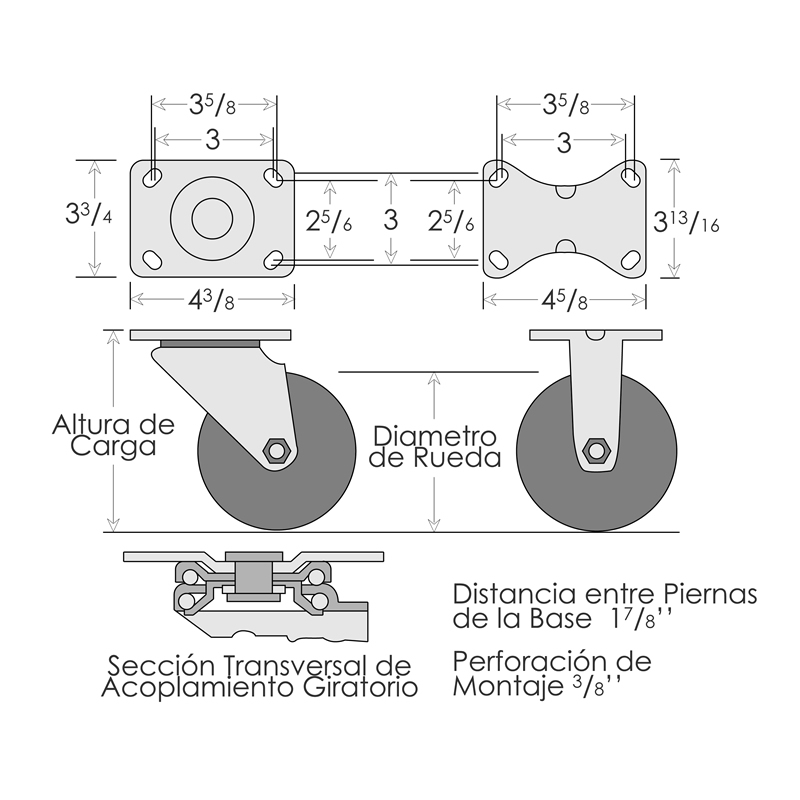 - Eje de rueda de 3/8".Base con remache permanente para mayor duración.