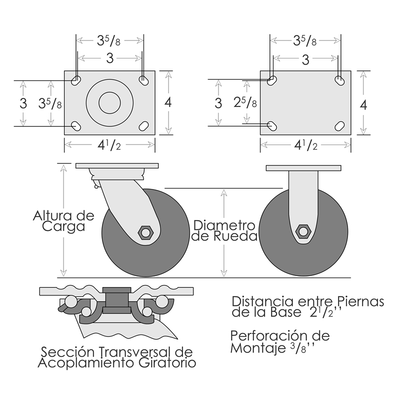 - Freno Metálico Frontal - Disponible en todos lo modelos giratorios excepto en 3-1/4" de diámetro y Modelos V-Groove (Especifique BRK1).
