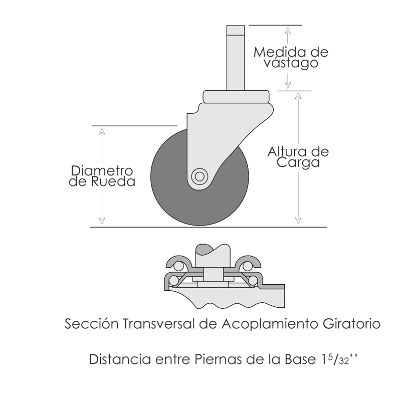 No. de Modelo | Descripcion de Rodaja | Diametro de Rueda | Ancho de Rueda | Capacidad por Rodaja | Rueda | Balero | Altura de Carga | Radio de Giro | Peso |