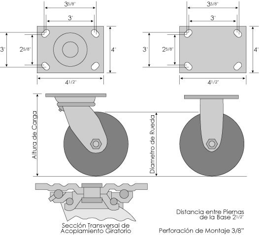 No. de Modelo | Descripcion de Rodaja | Diametro de Rueda | Ancho de Rueda | Capacidad c/u en libras. | Descripción de la Rueda | Tipo de Baleros | Altura de Carga | Radio de giro |